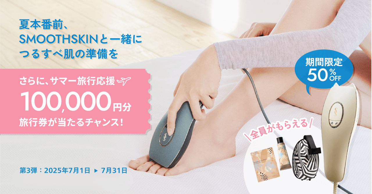 期間中、 SMOOTHSKIN(スムーズスキン)の脱毛器をご購入いただいた方の中から、抽選で1名様に「10万円トラベルクーポン」をプレゼント。